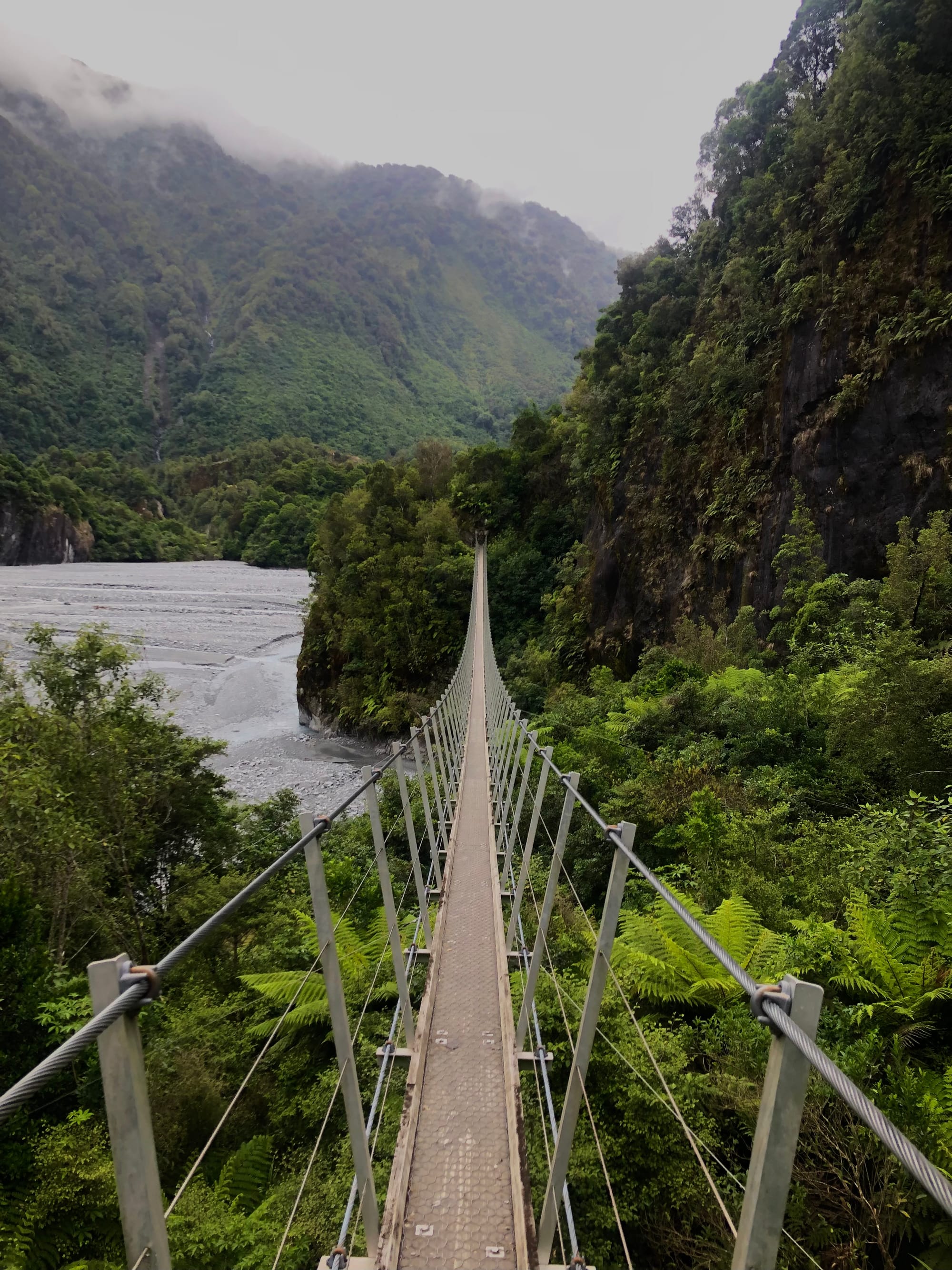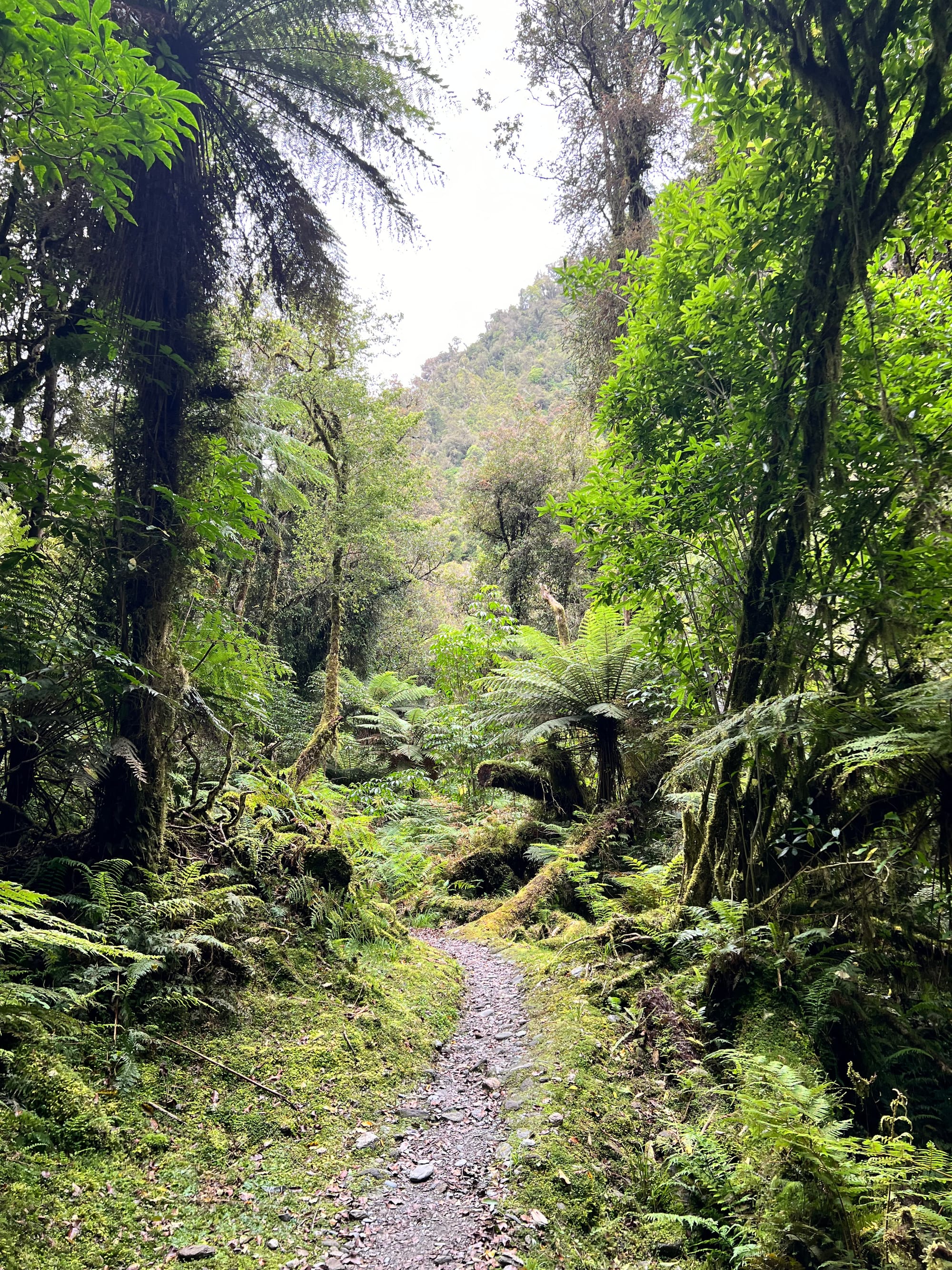 The next morning, I took a shuttle to the glacier car park (the town of Franz Josef is part of the glacier of the same name and only exists because of glacier tourism). The Roberts Point Track was often recommended to me, and despite the rain forecast, I wanted to give it a try. New Zealand definitely takes its warning signs much more seriously than Austria; I passed a sign with WARNING written large, indicating that the track was only suitable for experienced hikers and that people have died here. From then on, it was clear to me that I wouldn't hike all the way to the top. I hiked for about 1 hour and 30 minutes and then turned back because I had an uneasy feeling. Back at the beginning, I took another walk, and just as I reached my destination, it started to rain. Fortunately, I turned back, because hiking back there in the pouring rain would have been anything but fun. Unfortunately, the shuttle bus only runs every 2 hours, so I had the choice between waiting 1 hour and 30 minutes in the rain or walking 40 minutes back to town in the rain. So, I walked back to Franz Josef. After this adventure, I treated myself to a chocolate muffin and later in the evening, I joined my girls in the hot tub. It was an eventful day, and accordingly, I was very tired.