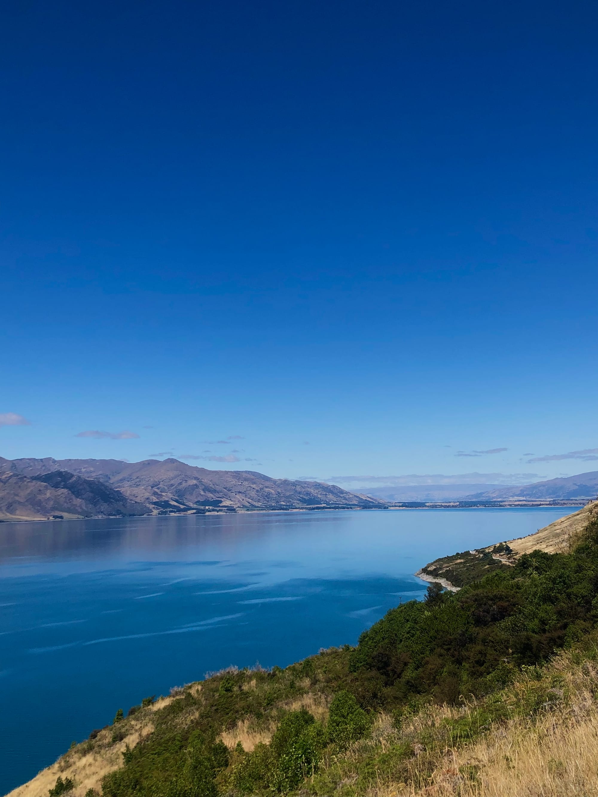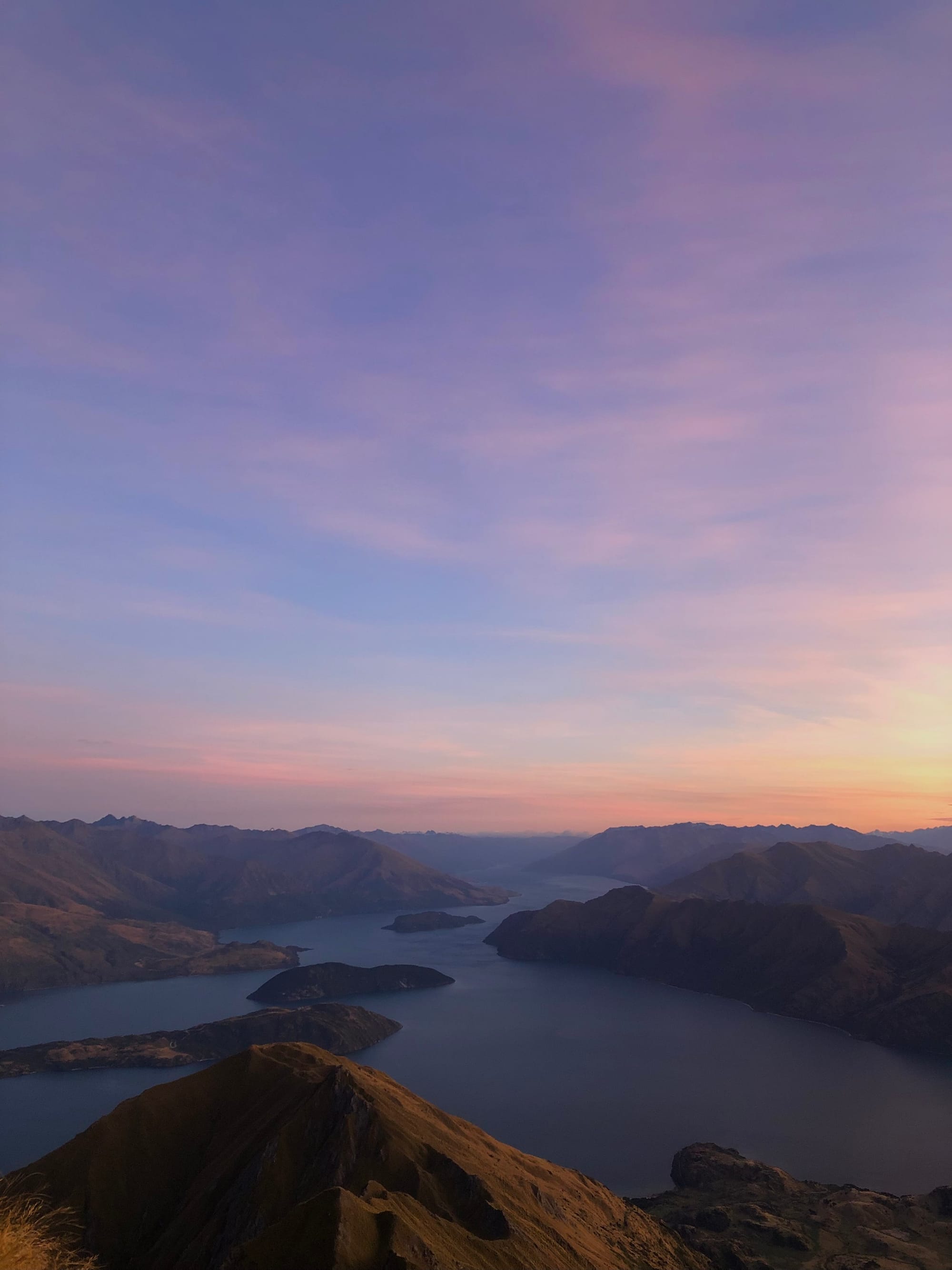 So the four of us walked comfortable up together, although I don't believe that the Roys Peak hike can be considered in any way comfortable. And the blogs I read before were right... In my opinion, the hike is not something that can be enjoyable. Compared to Roberts Point in Franz Josef, which was a challenging but fun track, this was more like torture. Okay, maybe I'm exaggerating a bit... it was still fun because of my companions and their excellent taste in music! The stars were also a great bonus because there was hardly any light pollution. I must also say I was very glad that I could hike up in the dark because it wouldn't have been fun in the heat either. Slowly, the sun rose, and we got closer to our goal. Arriving at the summit, an absolute spectacle awaited us: the sun rose slowly and painted the sky over Lake Wanaka beautifully pink. It was freezing cold, so cold that my toes slowly froze, but the view was worth every minute of hiking. The hike up, but also the view, literally took my breath away. We then took some souvenir photos and had some snacks, then went back down to the viewpoint. Most people who hike up there during daylight only go to the viewpoint to take photos. So there were already some people there. The hike down became increasingly strenuous as the sun is really not to be underestimated, also in the rest of New Zealand. When we arrived at the bottom, the shuttle took us back, and I managed to check out of the hostel on time. The hostel was very accommodating and stored my luggage and also offered that I could still use all the other facilities. But I went to the lake and slept there in the sun for almost two hours until the bus came and continued to Queenstown and my friends!